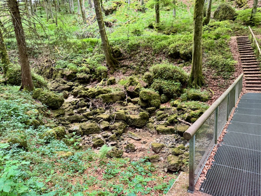 Hier ist im Altburger Bach kein Tropfen Wasser zu sehen. Das Tal wirkt völlig ausgetrocknet, obwohl es kürzlich geregnet hat. Ein Schild gibt die Erklärung dafür. Das Wasser verschwindet etwa 700 m oberhalb in Klüften des verkarsteten Kalkuntergrunds und tritt erst unterhalb dieser Brücke wieder ans Tageslicht.